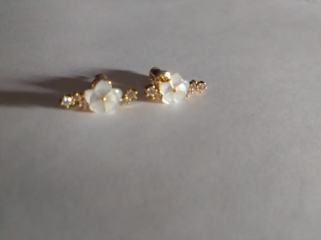 • Matériaux : cuivre plaqué or véritable, cristaux de zirconium (imitation diamant), fleur en nacre